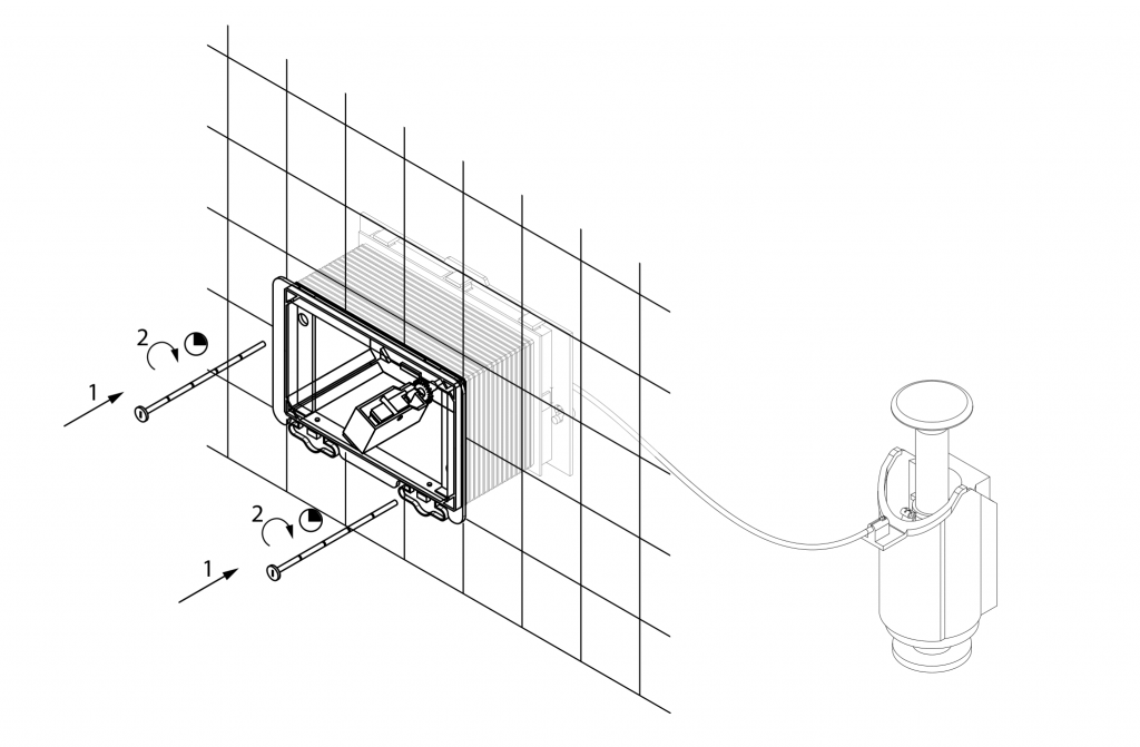 Соедините трос (поз. 2) со смывным механизом (поз. 4) и рычагом сопряжения (поз. 3) как показано на рисунке. Далее примерьте дистанционный короб (поз. 5) к монтажной панели инсталляции (поз. 1) и убедитесь, что короб выступает от стены на 3-5 мм, при необходимости дистанционный короб можно укоротить, как показано на рисунке ниже.