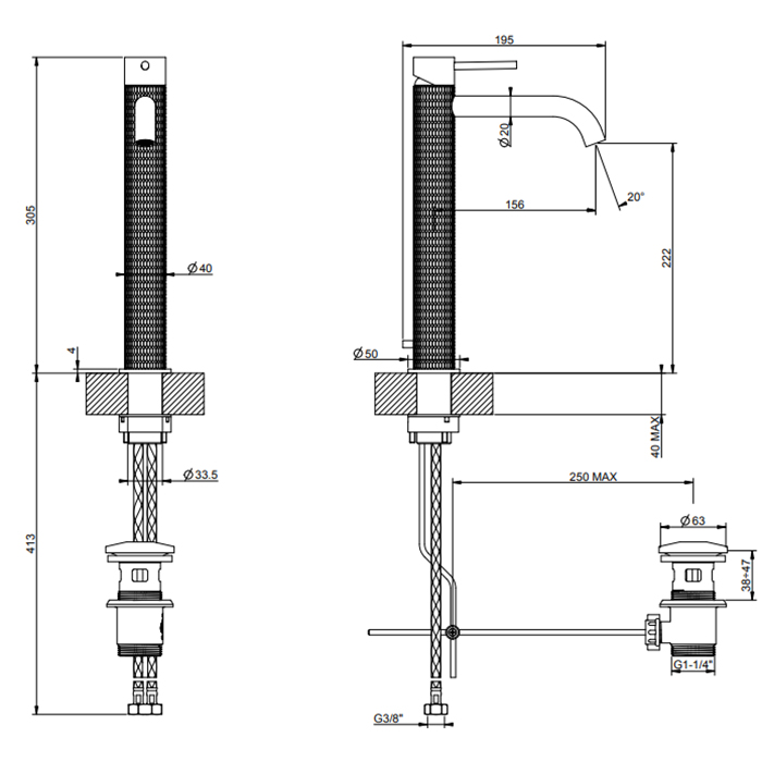 Смеситель Gessi Gessi316 54203#707 для раковины с донным клапаном, черный хром браш pvd