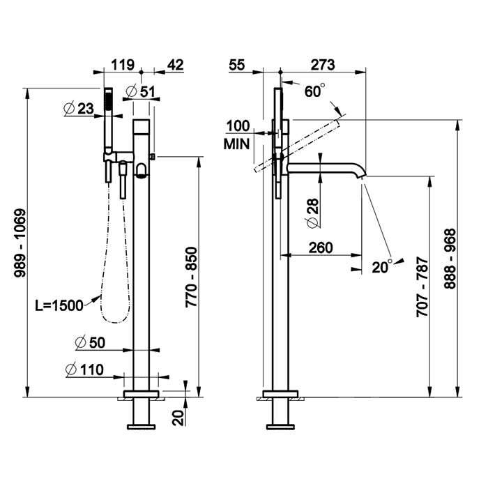 Смеситель Gessi Habito 70328#031 напольный для ванны с душем, хром