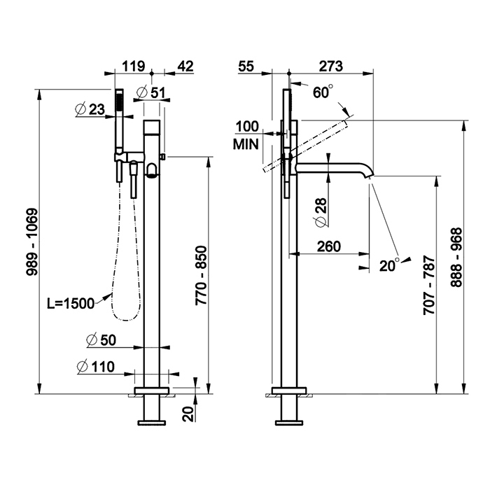 Смеситель Gessi Habito 70528#031 напольный для ванны с душем, хром