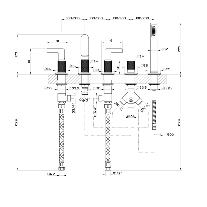 Смеситель Gessi Inciso 58040#149 для ванны с душем, никель браш