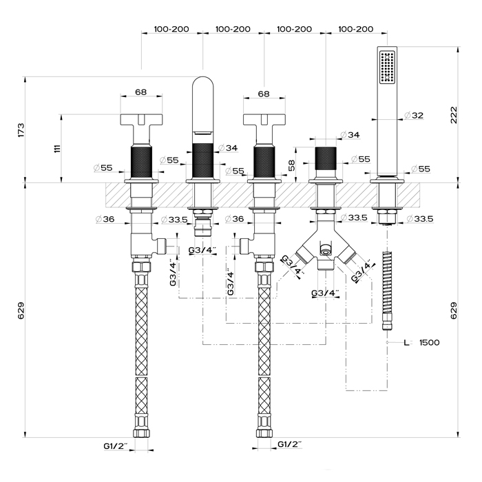 Смеситель Gessi Inciso 58140#149 для ванны с душем, никель браш