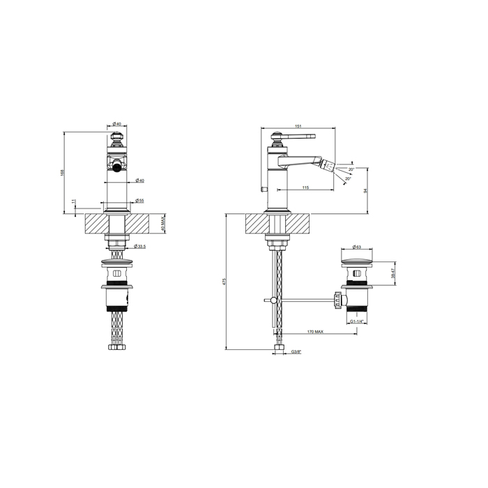 Смеситель Gessi Venti20 65007#710 для биде с донным клапаном, латунь глянец pvd